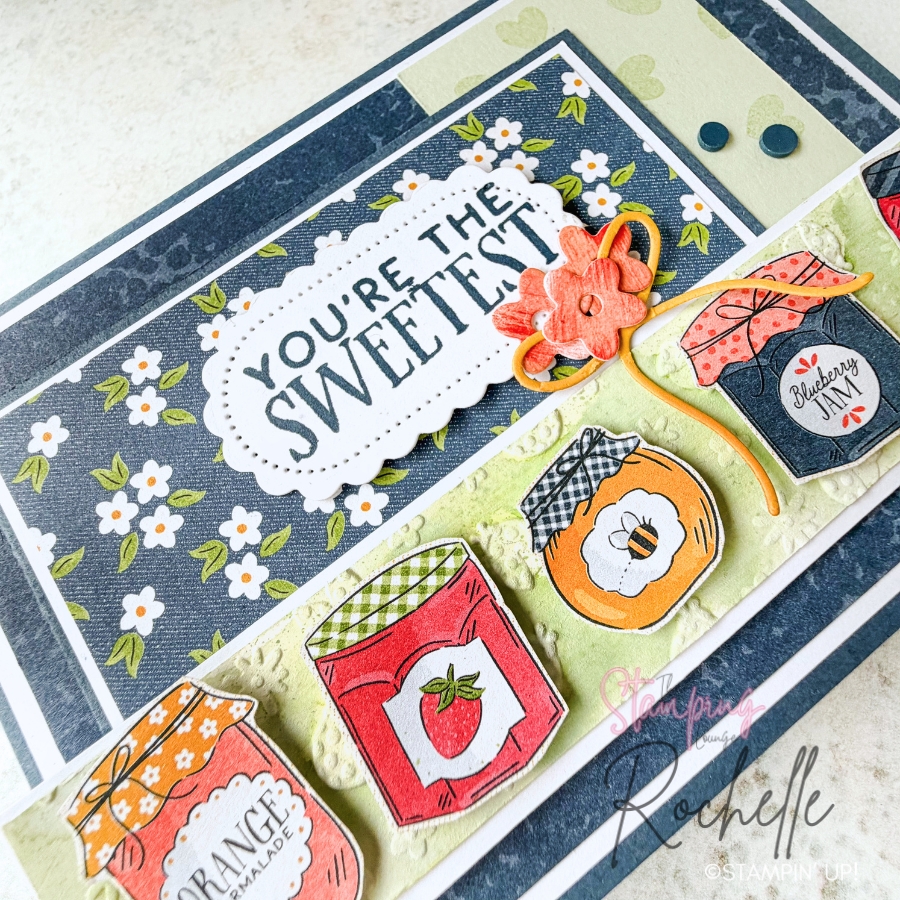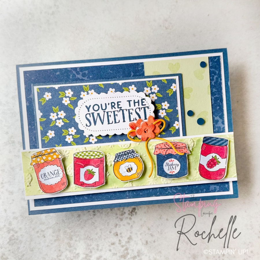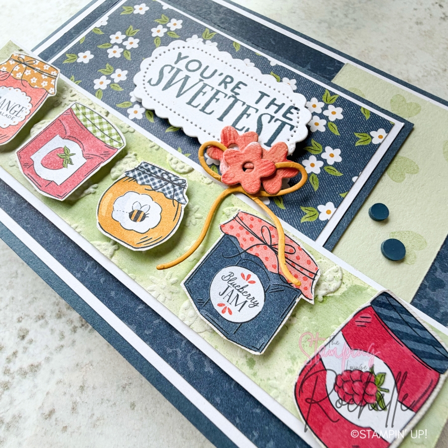 I’ve really made the most of the Designer Series Paper on this card—using it not just for layering, but also for those ‘sweet’ fussy cut jam jars to tie everything together beautifully.